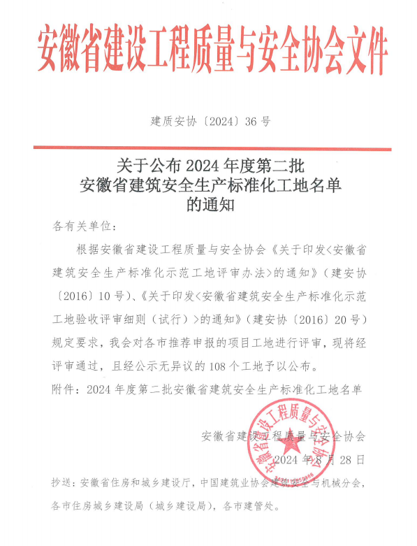 近日,安徽省建設(shè)工程質(zhì)量與安全協(xié)會公布2024年度第二批安徽省建筑安全生產(chǎn)標(biāo)準(zhǔn)化工地名單,由黃山建工集團(tuán)承建的國網(wǎng)安徽黃山供電公司運(yùn)維檢修及信息通信用房項(xiàng)目光榮上榜。
