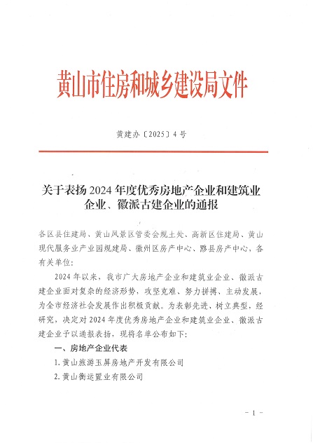 近日,黃山市住房和城鄉(xiāng)建設局發(fā)布了《關于表揚2024年度優(yōu)秀房地產(chǎn)企業(yè)和建筑業(yè)企業(yè)、徽派古建企業(yè)的通報》,黃山建工集團榮獲2024年度優(yōu)秀建筑業(yè)企業(yè)稱號。